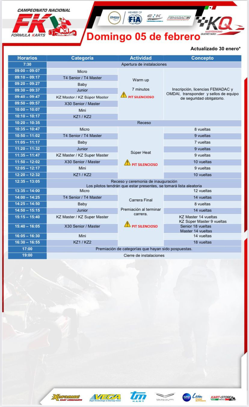 PROGRAMA FIN DE SEMANA 1ER FECHA FK 2023atencion77531 ene 20231 Min. de lectura¡Pilotos! Les compartimos el programa actualizado de la 1er fecha de Fórmula Karts en Kartódromo Querétaro